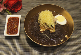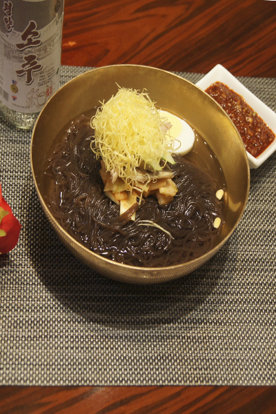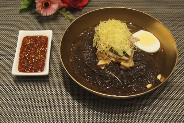 荞麦粉加荞麦粉量45%的70-80℃热水和面.如果和的时间过久或者醒面时间长,面条不上劲.用压面机压成面条,把牛肉、猪肉、鸡肉,萝卜片20克放入凉水里煮,把熟好的牛肉、猪肉切成柳树叶片,鸡肉撕成丝。原汤放入盐1/2、酱油调味冷却待用.,牛肉和猪肉切成薄片.白菜,萝卜洗净加盐10克稍腌,放入葱花,蒜泥,糖,辣椒粉做泡菜.黄瓜切成柳叶片,梨去皮切成5厘米长1的大小,泡浸在投入5克盐的盐水中.鸡蛋煮熟.取一只碗放入饶个圈的面条,上放泡菜和肉浇头,逐次放入黄瓜,梨,煮鸡蛋.最后沿碗边放入汤卤上桌.
