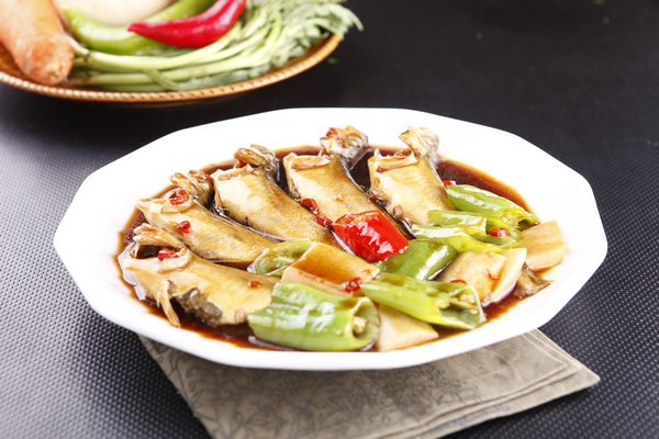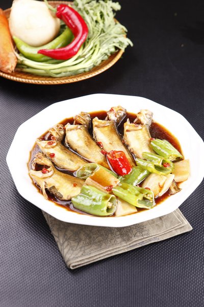 将鱼去鳃处理干净,水600克加酱油,糖,盐,姜末,蒜泥,胡椒粉,油搅打成调味汁。将萝卜片放入炒锅内垫底,将鱼围摆在盘中,浇入调味汁,上放辣椒片烧开,不断的舀入鱼上面继续烧。待卤汁收干入味时出锅装盘上桌。
