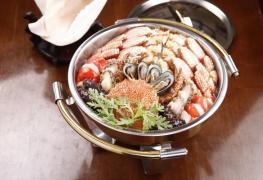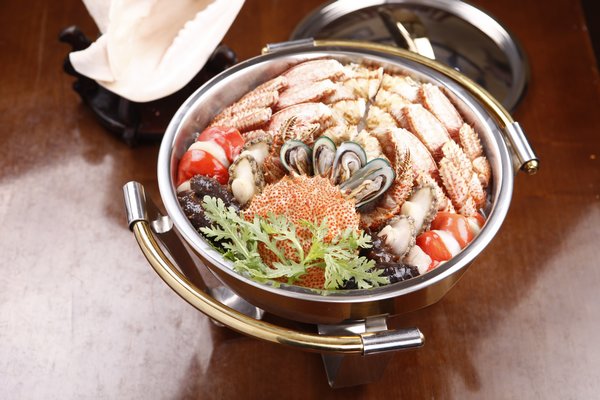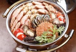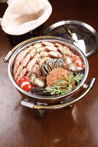 平菇焯水,贻贝刷干净待用,胡萝卜切成片,扇贝切成片,剞上刀纹。鲍鱼,海参切成片。在火锅内铺平金针菇,上放平菇,带壳的贻贝,小红萝卜垫底,放入大闸蟹,鲍鱼片,海参片,扇贝片。将茼蒿摆在两边.在锅内放入猪头,猪骨头,鳜鱼,煮5个小时做火锅汤,待汤汁乳白时加盐,蟹黄调味做火锅汤待用。此菜是将火锅内放入火锅汤烧开,随烫随吃的菜肴。