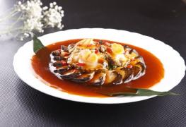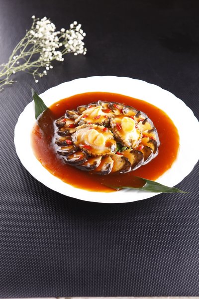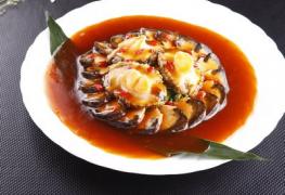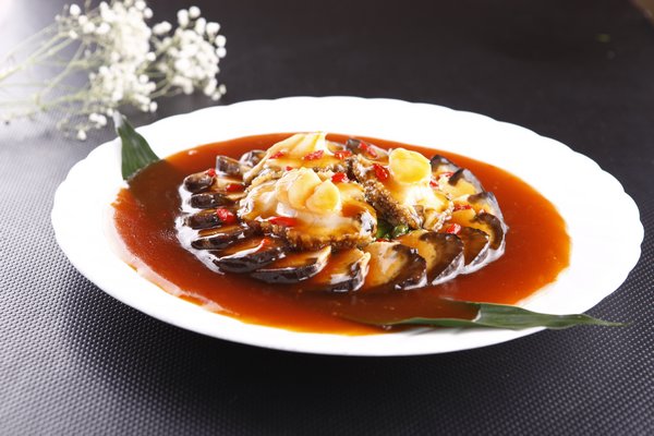 海参开膛取内脏烫,沥净水分,拍粉,将虾仁蓉和肥肉蓉塞入海参,上微波炉蒸10 分钟,待冷却之后,切成0.5厘米厚的大小,摆在盘中,将炒好的芦笋和鲍鱼围在其四周围,撒上枸杞子,淋入鲍鱼卤汁,用树叶点缀上桌。
