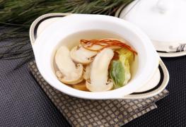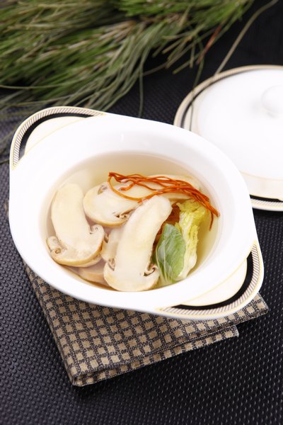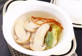 鲜松茸50克,金虫草1克,银杏3粒,油菜1张,味精0.2克,盐1克。