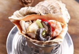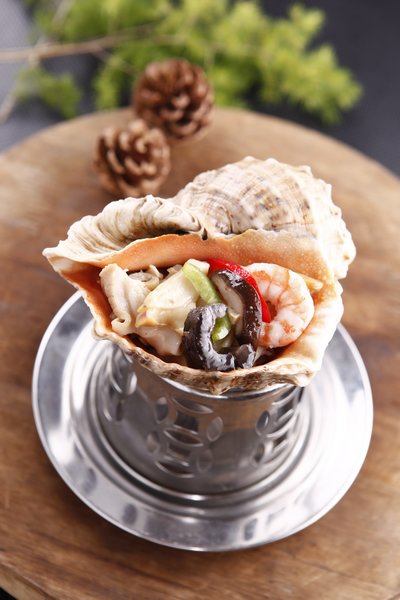 将海螺洗净,切成片,炒锅置上火 .加水,海螺片烧熟,加入盐,味精,胡椒 粉入味,捞出待用.虾子焯水,海参处理干净,顺长切成0.5~1厘米宽的大小,蘑菇也焯水,切成适宜的大小。在已消毒的海螺壳内放入海螺,蘑菇,虾仁,海参,浇入海螺原汤.放在酒精炉子上面烧热上桌。