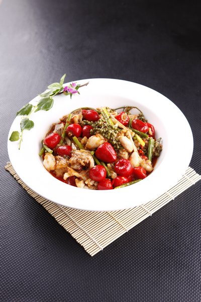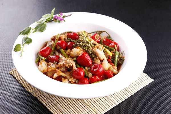 牛蛙取内脏,洗净.姜切成片,蒜剁细.芹菜和蒜薹切成4厘米长的大小.炒锅置上火,用油滑锅,投入姜片和蒜泥 炒出香味,加水300克和其他调味品烧开入味,放入精炼油和辣椒油略烧,起锅装盘上桌。