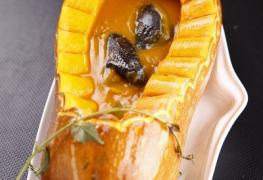 乌骨鸡取内脏,洗净.炒锅置上火,放冷水,鸡煮烂,捞出剁成一定大小的段.将南瓜切成1。5公斤的块,煮烂,拓成泥,与糯米粉 煮成粥.剩余的南瓜去瓤将调好熟烂的乌骨鸡连同粥放入南瓜里面,蒸20分钟,加盐,味精上桌.