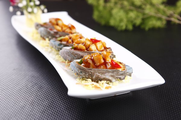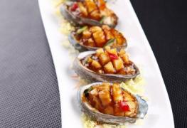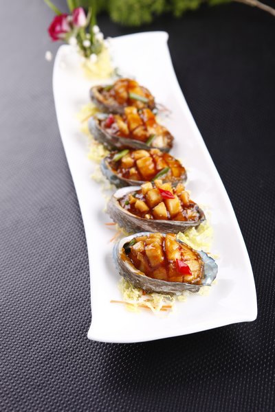 将鲍鱼放入沸水中煮15分钟,煮熟后洗净,沥去水分,剞上刀纹,拍淀粉炸,把它用多种调料品制作的卤汁包裹,放回鲍鱼壳中,小白菜烫一下修成适宜的大小,放入盘中垫底,将鲍鱼放在其上面上桌。