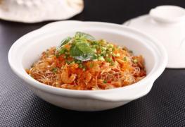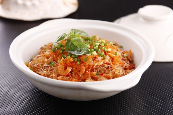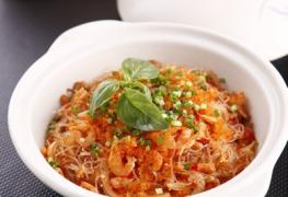 粉丝60克,虾仁30克,洋葱50克,泡椒30克,鱼子酱30克,味精1克,糖3克,辣椒粉5克,鸡精2克,食用油30克,盐2克