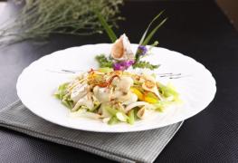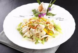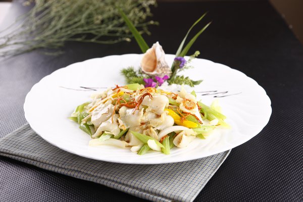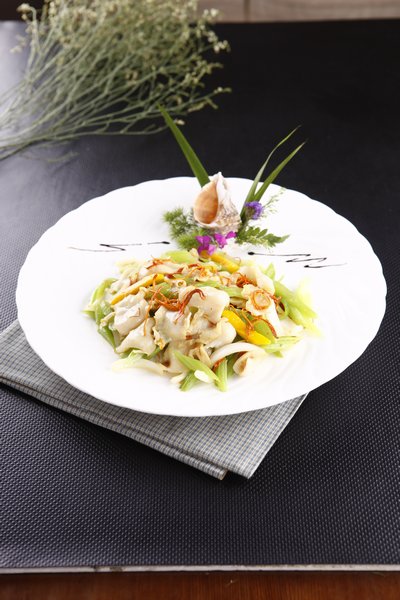 海螺取肉,在流水中洗净,批成大的片,加盐,淀粉,鸡蛋液拌匀,在130℃的油温中烫一下。芹菜去根顺茎去老筋,洗净,斜切成马耳形,过油后与盐,味精一拌待用。红椒,洋葱切成与芹菜相似的大小。金虫草过水,浸泡在小碗中。炒锅烧热,用油滑锅,放入洋葱,红椒炒出香味,投入海螺,芹菜,金虫草,蒜泥,盐,牛肉精,糖略炒,用湿淀粉勾芡,卤汁收干时,撒上香油装盘上桌。。