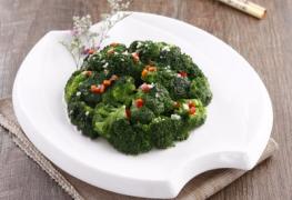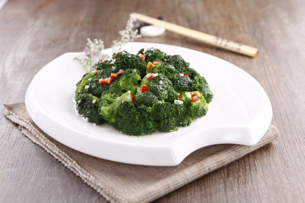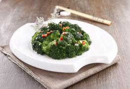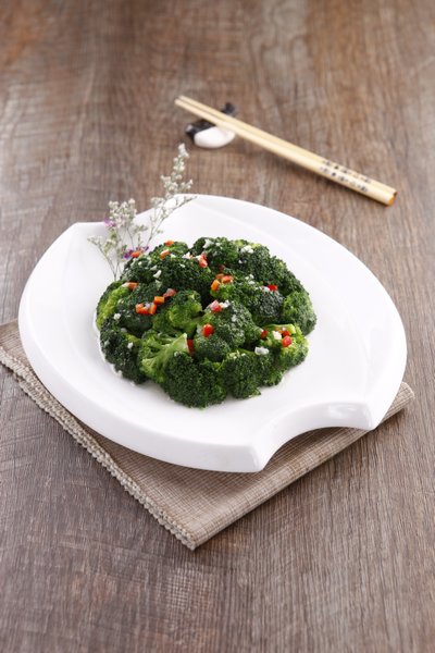 蒜剁细,红椒去籽,剁成米。用油滑锅,放入蒜,红椒炒出香味,投入西兰花炒,翻锅几下,见表面欲滴时加盐,牛肉精入味,均匀整齐的装盘上桌。