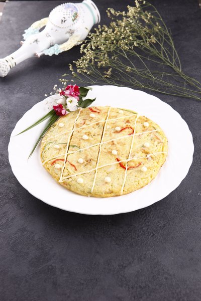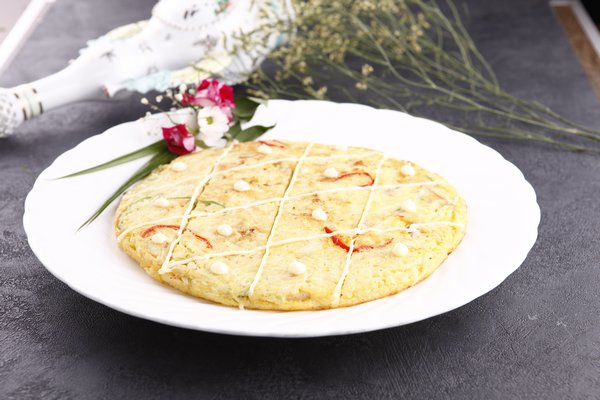 小葱切成5厘米长的段,卷心菜切成细丝,蟹柳,洋葱,红椒也切成丝。鱿鱼处理干净,去膜批成薄片。在锅里放油烧热。取一只碗,放入卷心菜,小葱,蟹柳,洋葱,红椒,鱿鱼,鸡蛋打匀,加盐,味精,面粉轻微的搅,至泡沫不瘪,不上劲。摊在锅中,转小火煎至两面金黄色时出锅改刀装盘。用蛋黄酱进行装饰上桌。