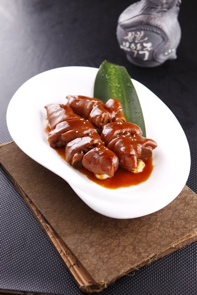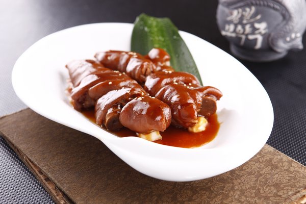 Wash hoofs, split them into halves and boil them slowly over normal fire. Cut welsh into pieces 3cm long and slice ginger and garlic. Shred whole red pepper. Remove nails from hoofs and put them in pan and pour new water into pan. Then add salt, alcohol, sliced ginger, welsh pieces, garlic and steam hoofs completely. Put them on plate and garnish and serve.