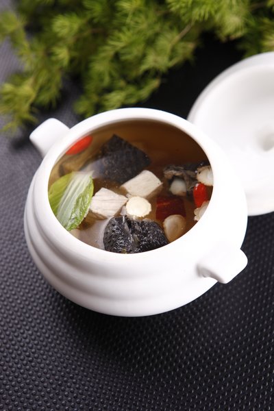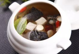 Wash black chicken, pork, salted pork, medical herbs, Dangsam, Longan and dried scallop and put them in a vessel. Put salt, monosodium glutamate, chicken powder, sugar, liquor for cooking, powdered pepper into 250g water in other vessel and mix them. Pour mixed solution into the first vessel and cover the vessel. Bring it in a boil for 40 minutes and serve.