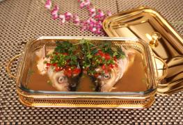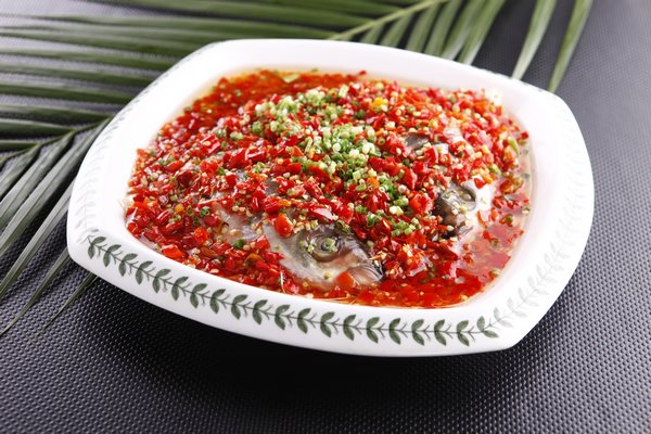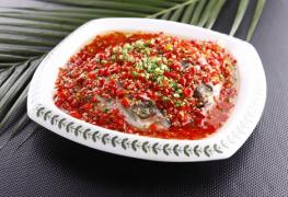 Remove scales from head, split it into two and wash it. Mince roughly the salted ripe red pepper. Season head with several condiments and remain still for 30 minutes. Steam it in a steamer for ten minutes. Boil 100g oil thick and pour it over head and serve.