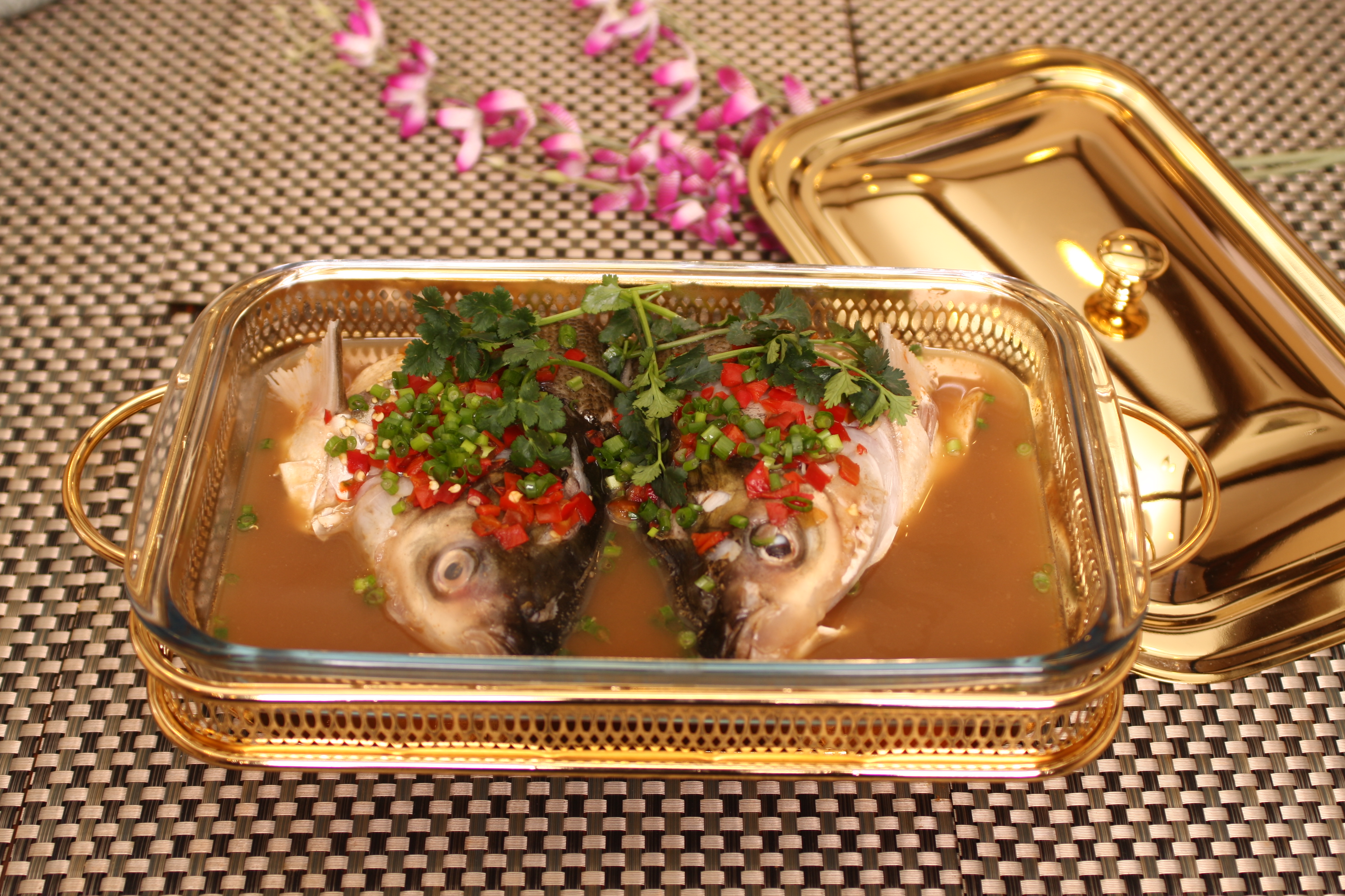 750g head of megalobrama tegalomaris, 0.3g salted ripe red pepper, 7g sugar, 10g abalone sauce, 3g chicken powder, 10g salted small ripe red pepper, 2g monosodium glutamate,4g salt, 100g oil.