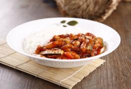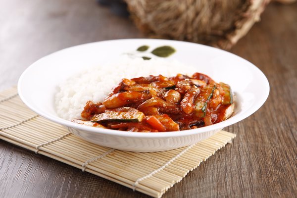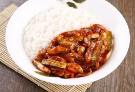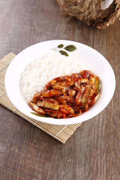 100g white rice, 100g squid of Korean west sea, 20g cucumber, 1 clove of garlic, 1 tbsp spiced soy sauce, 1/4 tsp salt, 1/4 tsp monosodium glutamate, 1/4 tsp sugar, 1/4 tsp sesame, 3 drops of sesame oil, 2tbsp oil, 1 thin small green onion