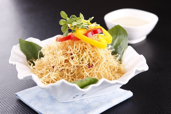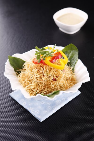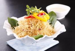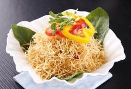 Peel potato, slice in 2 mm thick and sieve. Extract starch from its liquid and drain off the water and fry at 180℃. Garnish with 3 leaves of spinach, cabbage, violet cabbage, cucumber, and red bell pepper and serve.
