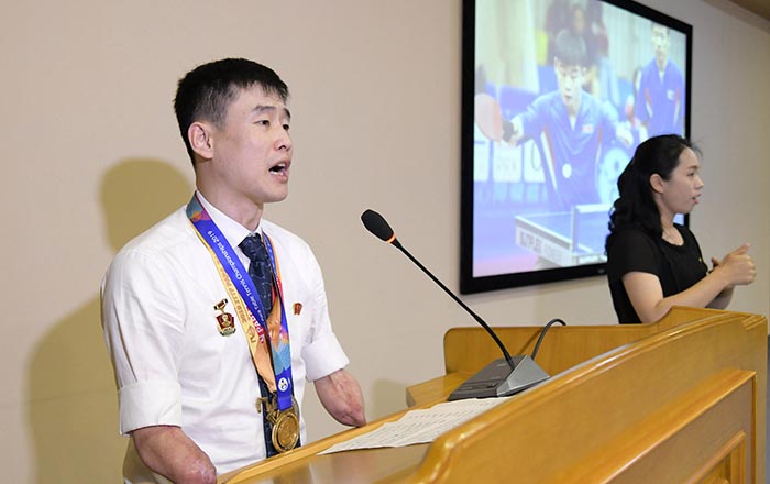 용감하고 열정적인 조선청년특유의 배짱과 기세로 우리 조국의 발전사에 창조와 위훈의 자욱을 새겨가는 자랑스런 청년대오에는 조선장애자체육협회 장애자체육선수들을 비롯한 장애자청년들도 있다.